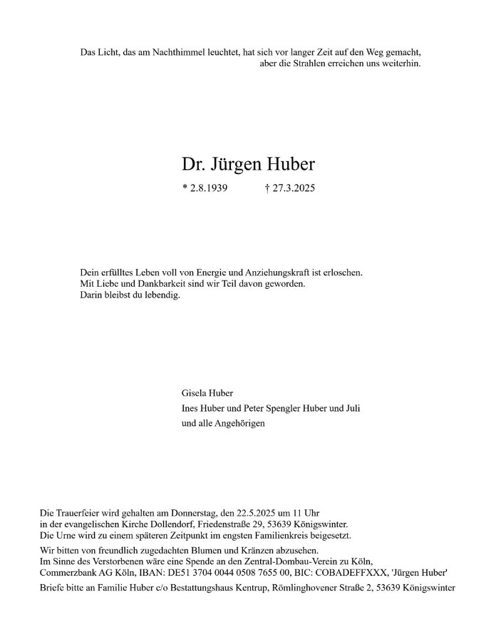 in diesen Tagen fühlen wir mit Ihnen und wünschen Ihnen von Herzen, dass Sie aus den glücklichen Erinnerungen Kraft schöpfen, um positiv in die Zukunft zu gehen. Diese Gedenkseite möge Ihnen dabei helfen, Ihre Trauer zu teilen und das Andenken gemeinsam wachzuhalten.